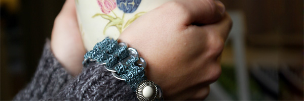 BeskrivningArmbandet består av flärpetter i aluminium från återvunna läskburkar. Flärpetterna är sammanflätade med blå spets och har en dekorativ knapp som spänne. Alla armband från emsa design levereras i askar som tillverkats av petflaskor.![]() ![]() |